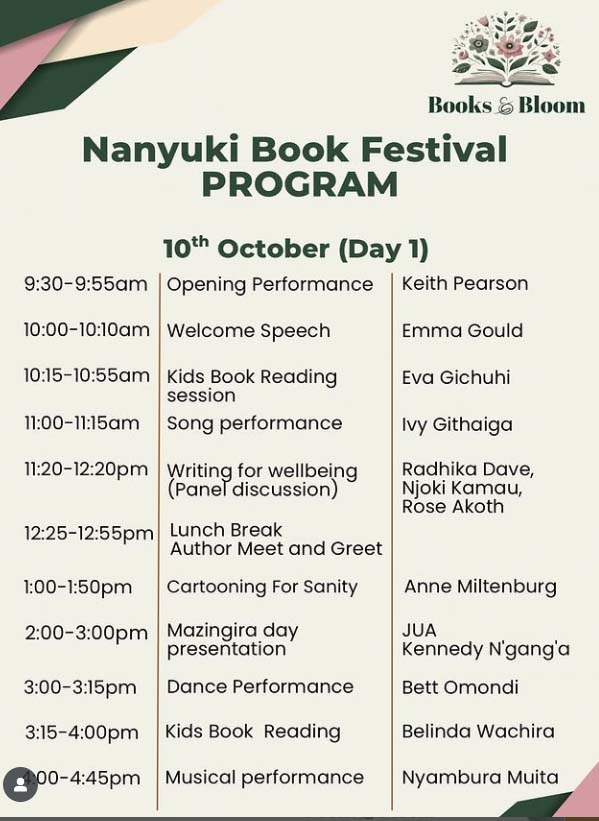 The Nanyuki Book Festival is a new literary festival dedicated to bringing together authors, publishers, booksellers, educators, and readers from across Kenya and beyond, creating a vibrant space to celebrate the written word, inspire young readers, and promote a culture of literacy. The initiative of the Rose Akoth-led Books & Bloom is a bookshop and library that will be hosted at the Braeburn Nanyuki International School.